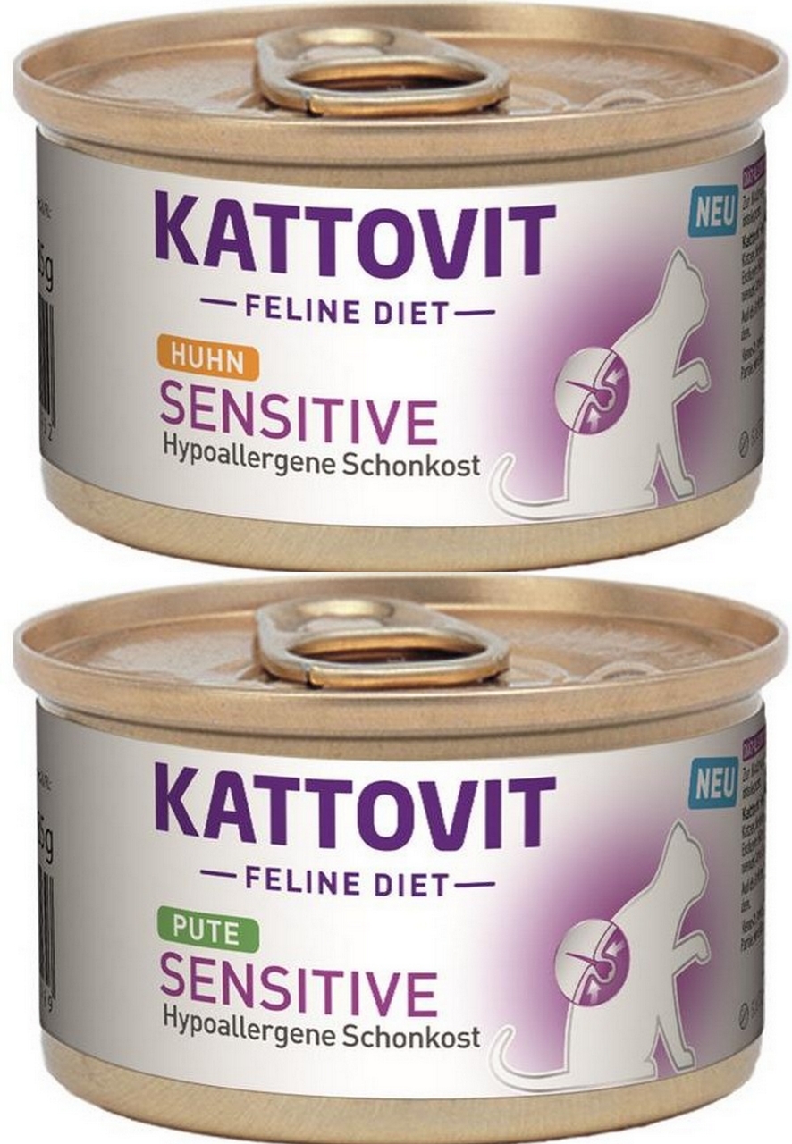 Kattovit Feline Diet Sensitive - Hypoallergene Schonkost (D-Rezeptur) in 85g Dosen. Zur Minderung von Ausgangserzeugnis- und Nährstoffintoleranzerscheinungen.