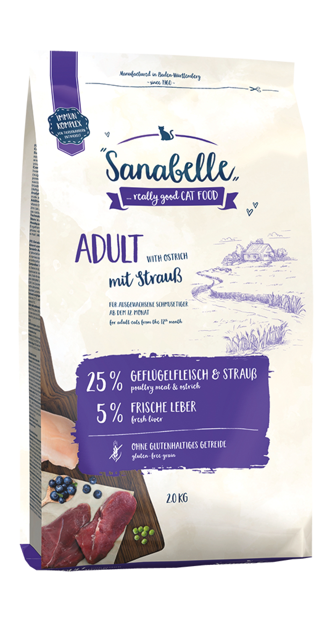 Sanabelle Adult mit Strauß ist eine bekömmliche und schmackhafte Vollnahrung zur bedarfsgerechten Ernährung ausgewachsener Katzen. Die ausgewogenen Gehalte an Mineralstoffen, Spurenelementen und Vitaminen sind eine Grundlage für Vitalität und Lebensfreude und unterstützen die natürlichen Abwehrkräfte Deiner Katze.