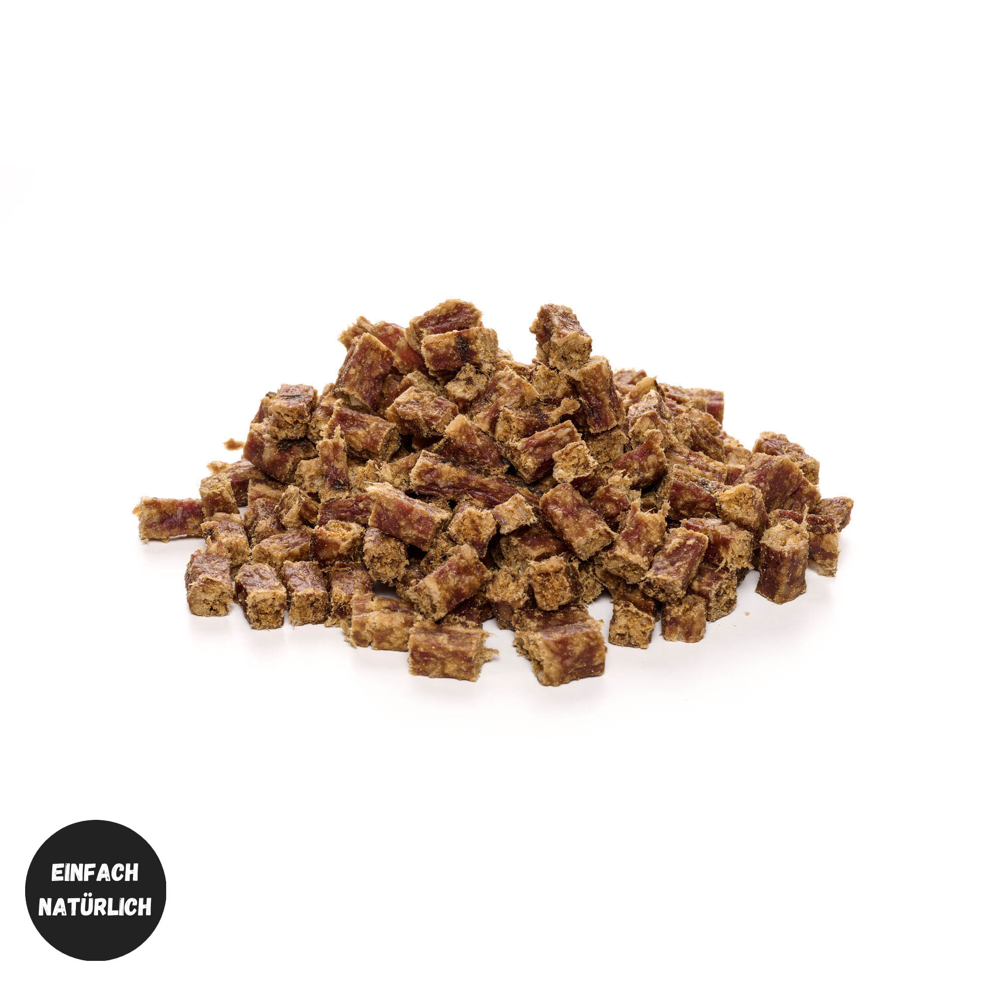 Unsere Entenfleisch-Würfel soft sind ca. 1cm lang und 0,5cm breit und für alle Hunde von jung bis alt und klein bis groß geeignet.