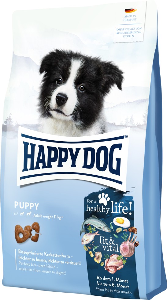 Bekömmliche und ausgewogene Vollnahrung für Welpen für eine optimale Entwicklung Happy Dog fit&vital Puppy ist eine ausgewogene Vollnahrung für Welpen ab dem 1. Lebensmonat. Es beinhaltet die Vielfalt von 5 ausgewählten tierischen Rohproteinen bester Qualität mit glutenfreiem Reis, diese sorgen für eine optimale Entwicklung deines Welpen. Gut verträgliches Lamm, leicht verdauliches Geflügel, schmackhaftes Rind, nahrhafter Fisch und hochwertiges Eiprotein sowie der optimale Fett- und Rohproteingehalt unterstützen den Welpen in den wachstumsintensiven Monaten und sorgen für ein gesundes Wachstum. Wertvolle Neuseeland-Muschel, Calcium und Vitamin D3 tragen dazu bei, dass Knochen, Sehnen, Bänder und Gelenke deines Welpen stark und belastbar werden. Fisch und Leinsamen, die reich an Omega-3- und Omega-6-Fettsäuren sind, sorgen für ein glänzendes Fell und eine gesunde Haut. Ein darmunterstützenden Vitalstoffkomplex aus speziellen Hefen, B-Vitaminen, Antioxidantien und Kräutern unterstützt die Darmflora und den gesamten Magen-Darm-Trakt. Für ein starkes Immunsystem im Erwachsenenalter muss bereits im Welpenalter auf eine ausreichende Vitamin C Versorgung geachtet werden, weswegen es natürlich in Happy Dog Baby Original enthalten ist. Basierend auf dem Happy Dog Natural Life Concept wird dein Hund so mit allem versorgt, wovon sein Organismus ganzheitlich profitiert und er unbeschwert in ein langes und gesundes Hundeleben starten kann. Du fragst dich, warum wir uns bei der Krokette für die einzigartige Herzform mit Loch in der Mitte entschieden haben? Dank ihrer speziellen Form mit Loch in der Mitte zerbricht sie schneller und kann dadurch besonders leicht zerkaut und verdaut werden, da sie durch die größere Oberfläche im Magen optimal von den Verdauungssäften aufgeschlossen werden kann. Ab dem 7. Monat sollte langsam auf Happy Dog fit&vital Junior umgestellt werden.Während der Junghundephase wächst dein kleiner Liebling langsamer und benötigt daher eine weniger gehaltvolle Nahrung. Alleinfuttermittel für Welpen ab der 4. Lebenswoche bis einschließlich 6. Monat. *) getrocknet