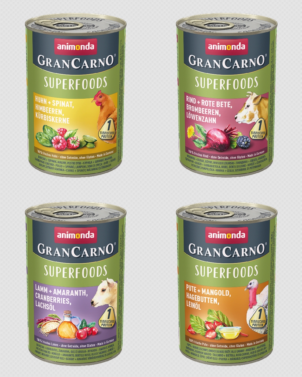 GranCarno® Superfoods steht für ausgewogene, leckere, gesunde Ernährung – mit natürlichen Superfoods und nur einer tierischen Proteinquelle – für ausgewachsene Hunde von 1 - 6 Jahren. Superfoods besitzen ein Plus an besonderen Nährstoffen, z. B. sekundäre Pflanzenstoffe, Antioxidantien, Mineralstoffe oder Spurenelemente und können so zum Wohlbefinden des Hundes beitragen. Die ausgewählten, frischen fleischlichen Rohstoffe garantieren den unvergleichlichen Geschmack, den Hunde so sehr schätzen.