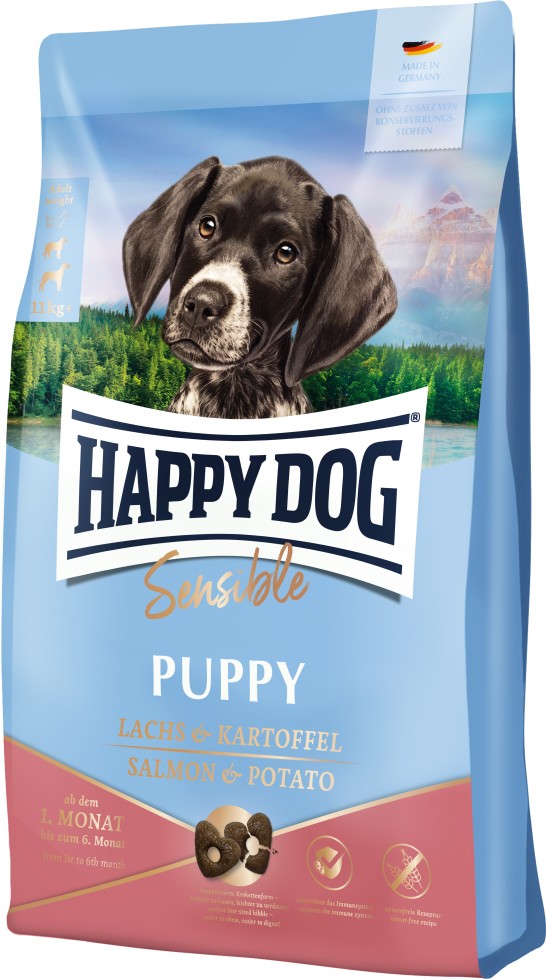 Sehr gut verträgliche Vollnahrung mit Lachs & Kartoffel für Welpen bis zum 6. Monat Happy Dog Sensible Puppy mit nahrhaftem Lachs und gut verträglicher Kartoffel ist eine hochverdauliche Vollnahrung für sehr sensible Welpen ab dem 1. Lebensmonat. Die glutenfreie Rezeptur ist optimal auf die Bedürfnisse von Welpen abgestimmt und versorgt deinen Welpen optimal in den wachstumsintensiven Monaten. Wertvolle Neuseeland-Muschel trägt dazu bei, dass sich der Bewegungsapparat deines Welpen optimal entwickeln kann. Calcium und Vitamin D3 sind im hohen Maße für die Festigkeit und eine optimale Entwicklung der Knochen zuständig. Omega-3- und Omega-6-Fettsäuren aus Fisch und Leinsamen sorgen für ein glänzendes Fell und eine gesunde Haut. Zudem unterstützen Leinsamen in Kombination mit einem darmunterstützenden Vitalstoffkomplex aus speziellen Hefen, B-Vitaminen, Antioxidantien und Kräutern die Darmflora und den gesamten Magen-Darm-Trakt. Auch das Immunsystem deines Welpen darf nicht zu kurz kommen, deshalb ergänzt Vitamin C die Rezeptur. Du wunderst dich vielleicht, warum wir uns bei der Krokette für die einzigartige Herzform mit Loch in der Mitte entschieden haben? Dank dieser speziellen Form bricht sie schneller und kann dadurch besonders leicht zerkaut und verdaut werden. Durch die größere Oberfläche kann die Krokette im Magen optimal von den Verdauungssäften aufgeschlossen werden kann. Ab dem 7. Lebensmonat solltest du deinen Welpen langsam auf Happy Dog Sensible Junior mit Lachs & Kartoffel umstellen.Während der Junghundephase wächst dein kleiner Liebling langsamer und benötigt daher eine weniger gehaltvolle Nahrung. Alleinfuttermittel für Welpen ab der 4. Lebenswoche bis einschließlich 6. Monat.*) getrocknet