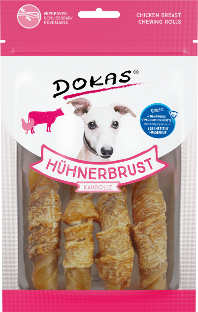 Der Klassiker unter den Dokas Kauartikeln. Gerollte Rinderhaut im Hühnchenfiletmantel mit einer feinen Rauchnote. Köstlich!