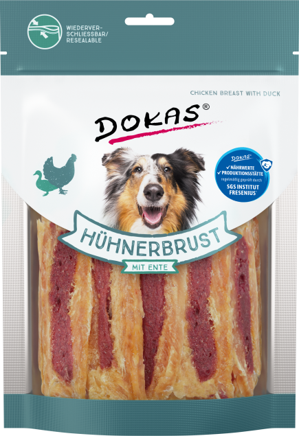 Entenfleisch umgeben von feinem Hühnerbrustfilet. Im wiederverschließbaren Beutel für die tägliche Belohnung.