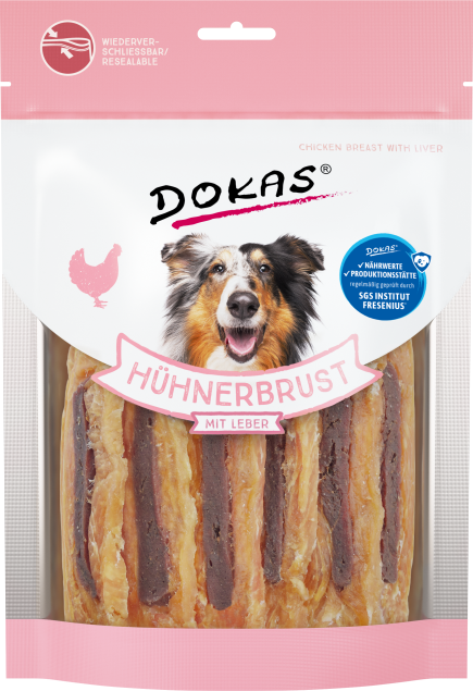 Hähnchenleber umgeben von feinem Hühnerbrustfilet. Im wiederverschließbaren Beutel für die tägliche Belohnung.