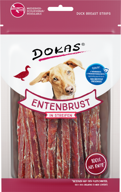 Der delikate Genuss für alle Geflügelfans – Entenbrust in feinen Streifen. Schonend luftgetrocknet und fettarm. 100% Entenbrustfilet (bezogen auf den Fleischanteil).