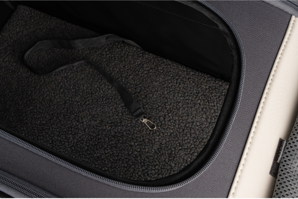 Stressfreies Reisen – Sicher & praktisch · Sichtfenster ermöglichen einen guten Rundumblick · Fest installierte Gurt im Innenbereich verhindert Herausspringen · Mehrere Öffnungen für eine einfache Handhabung · Integrierte Belüftungsöffnungen aus Mesh für eine gute Luftzirkulation · Angenehmes Ziehen durch integrierte Rollen · Gepolsterte Einlegematte für bequemen Transport