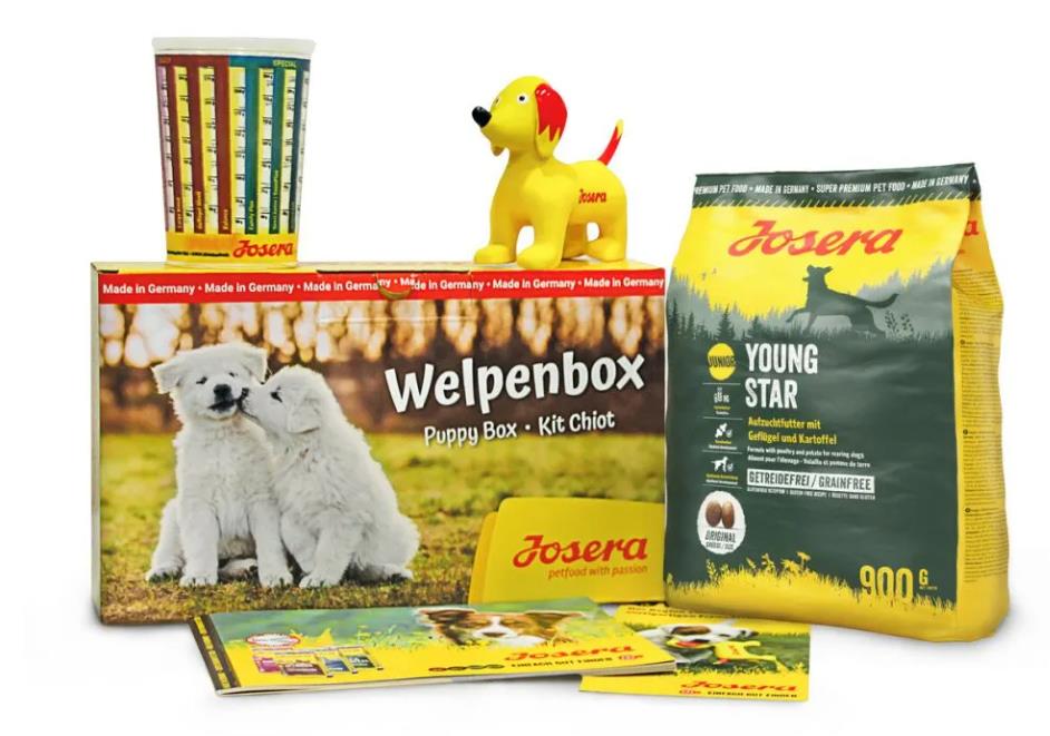 Welpenbox mit Josera YoungStar 900g, einer Broschüre, einer Welpenfibel, einem Hundespielzeug und einem Josera Messbecher